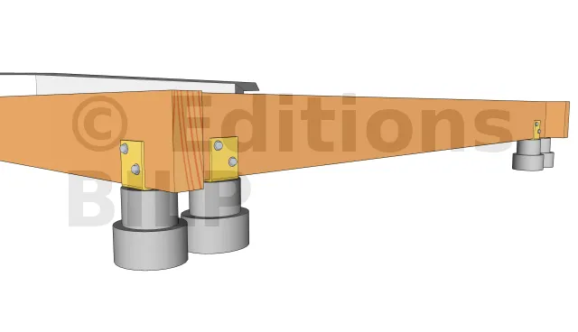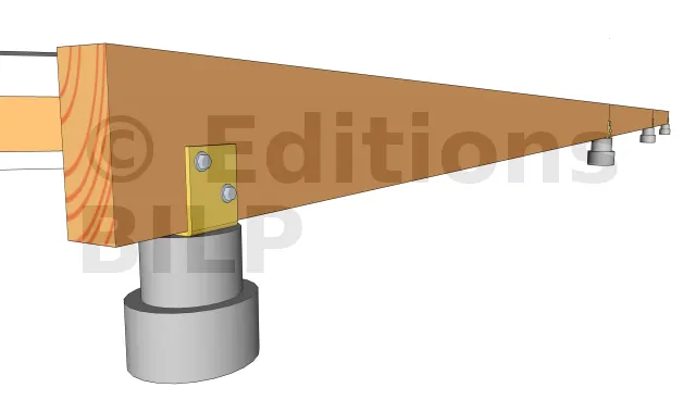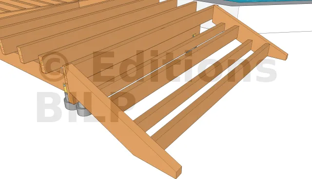 Les poutres porteuses sont fixées aux plots grâce à des équerres renforcées d’épaisseur 3mm. Pour ce faire, l’équerre est fixée au plot grâce à des vis d’ancrage à tête hexagonale et à la poutre porteuse avec des vis spéciales connecteurs ou un tirefond.