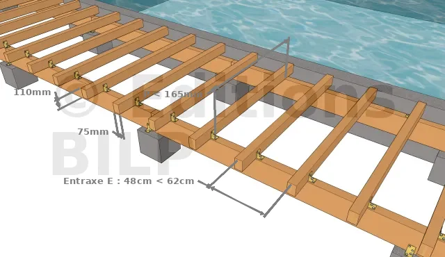 Comme nous avons déjà acheté nos solives, nous allons juste calculer la portée P des solives. Ces solives ont une largeur de 75 mm et une hauteur de 110 mm. Pour déterminer l’entraxe entre les solives, il est important de choisir une valeur qui est un multiple de la longueur des lames pour limiter au maximum les chutes. C’est la raison pour laquelle, nous l’avons fixé à 48 cm (< 62 cm).