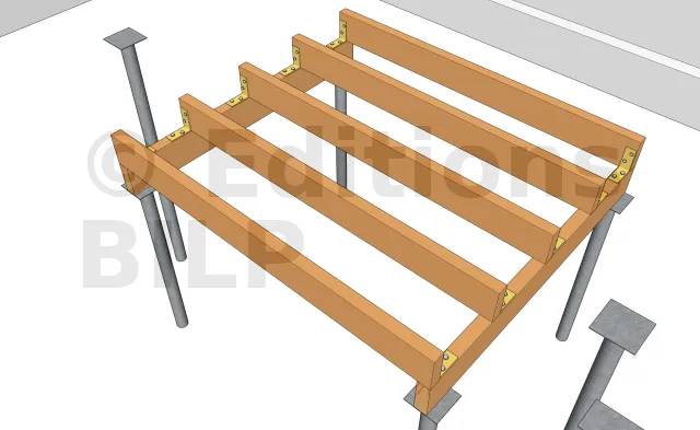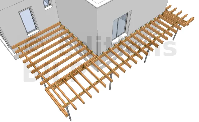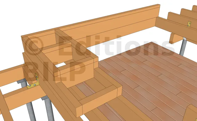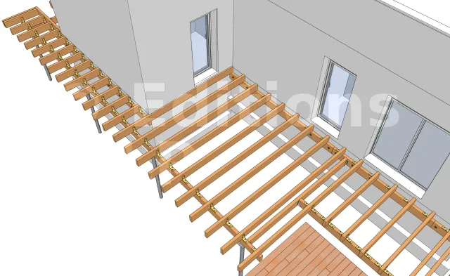 Comme pour les solives du jacuzzi, il existe également deux solutions pour la réalisation de cette fixation.La première est l’utilisation des équerres tels que des équerres renforcées ou des équerres simples qui seront fixées avec des pointes annelées ou des vis connecteurs. La deuxième est l’emploi des vis CombiConnect qui seront fixées par le dessus de la solive.