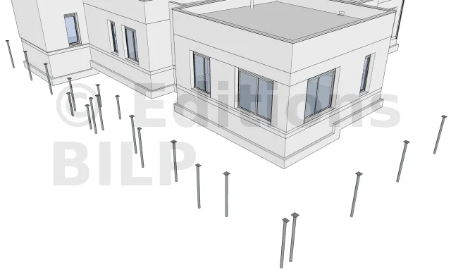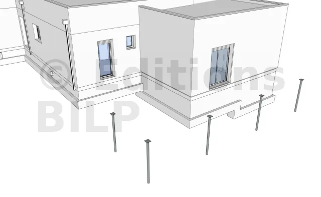 La réalisation du porte à faux a pour but de dissimuler au maximum les poteaux métalliques et les poutres porteuses afin de donner un côté aérien à la terrasse. Pour ce faire, il est nécessaire de décaler vers l’intérieur les poteaux métalliques et les poutres porteuses périphériques d’une quarantaine de centimètres.