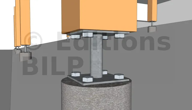 La fixation des poteaux aux plots en béton est réalisée avec des pieds de poteau. Pour ce cas en particulier, nous avons pris pour des pieds de poteau fixes. Ils sont fixés avec des tirefonds aux poteaux et aux plots en béton soit par des goujons d’ancrages, soit par scellement chimique des tiges filetées et par la suite les serrées avec des écrous et des rondelles.