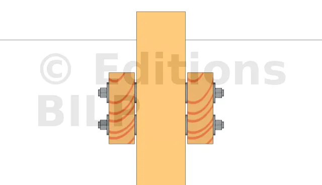 La fixation des contreventements est faite avec des tiges filetées, des écrous et des rondelles de charpente. Pour un meilleur esthétisme, les écrous sont dissimulés dans un trou borgne que l’on usine avec une mèche plate.