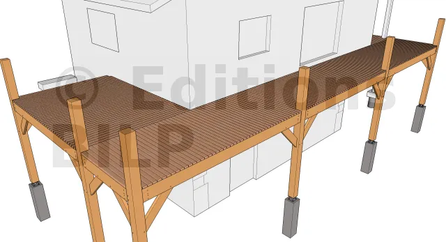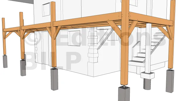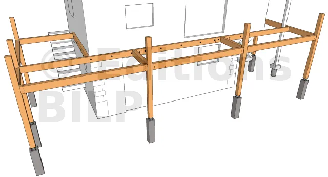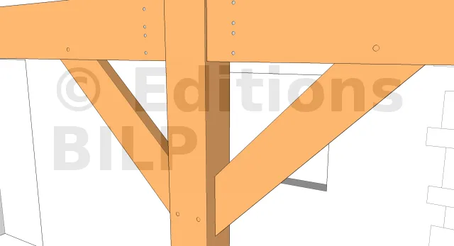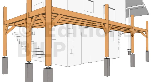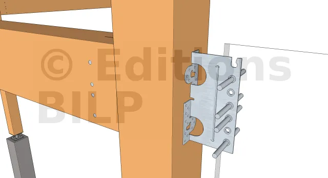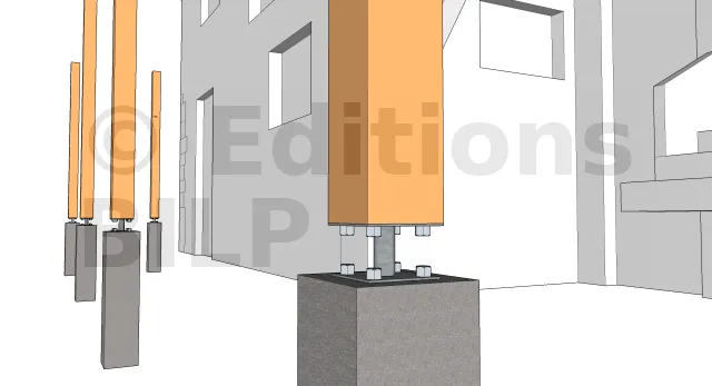Les poteaux sont fixés aux semelles par l’intermédiaire des pieds de poteau. Pour garantir la stabilité dans le temps, nous avons opté pour des pieds de poteau fixes. Ils sont fixées avec des tirefonds aux poteaux et aux plots en béton soit par des goujons d’ancrages, soit par scellement chimique des tiges filetées et par la suite les serrées avec des écrous et des rondelles.