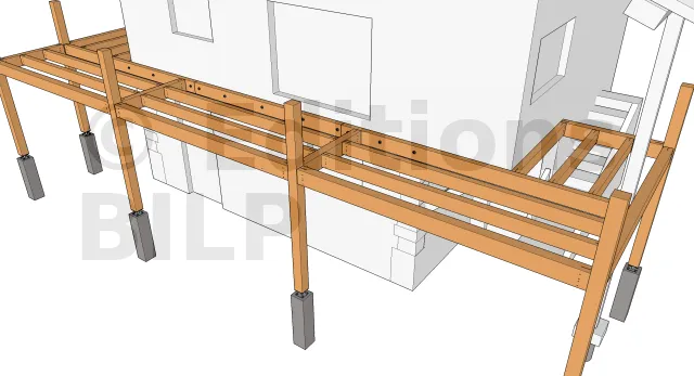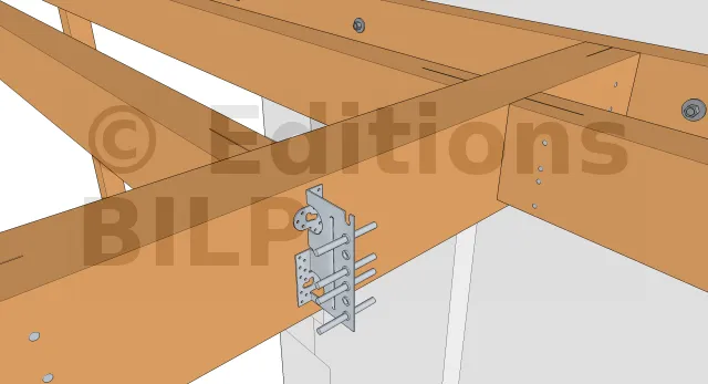 On aurait pu réaliser des encoches à queue d’aronde dans les poutres porteuses et y fixées les solives. Toutefois, c’est un vrai piège à humidité et il sera nécessaire d’enduire l’intérieure avec du produit de coupe et de couvrir la poutre avec un film de protection débordant.C’est la raison pour laquelle, nous avons opté comme pour la fixation des poutres porteuses, d’avoir recours à des étriers en âme intérieure en Inox, des vis et des broches en Inox.