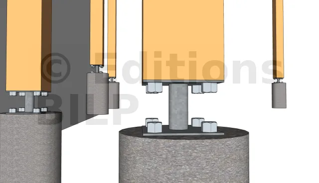 Détails des fixations des poteaux sur les plots en béton