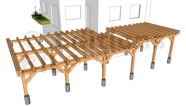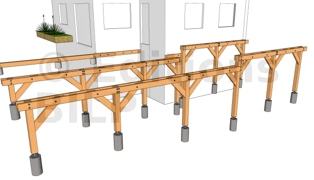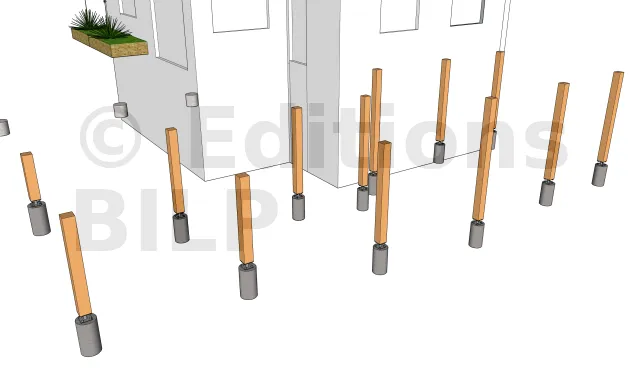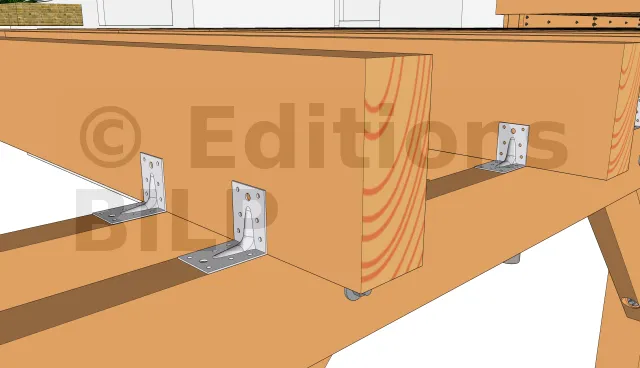 La fixation se fait grâce à des équerres renforcées d’épaisseur 3mm. Pour ce faire, l’équerre est fixée au plot grâce à des vis d’ancrage à tête hexagonale et à la poutre porteuse avec des vis spéciales connecteurs ou un tirefond.