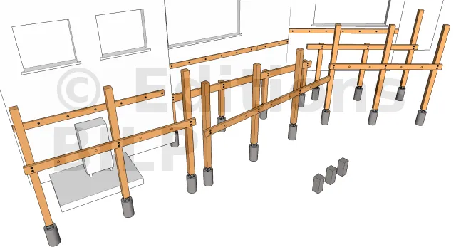 Elles sont fixées aux plots avec des équerres renforcées d’épaisseur 3mm. L’équerre est fixée au plot avec des vis d’ancrage à tête hexagonale et à la crémaillère avec des vis spéciales connecteur ou un tirefond.