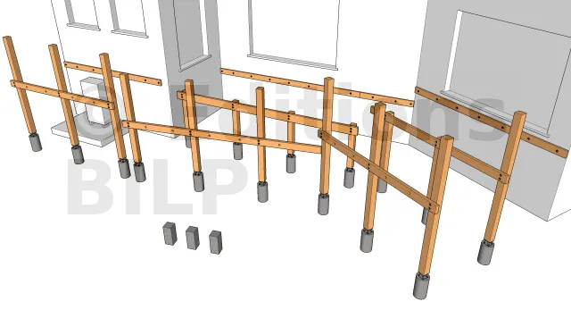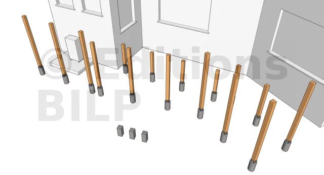 La mise en place des poteaux commence toujours par les poteaux d’angle dans la mesure où ils serviront d’appuis aux extrémités et d’aboutages pour les poutres porteuses.