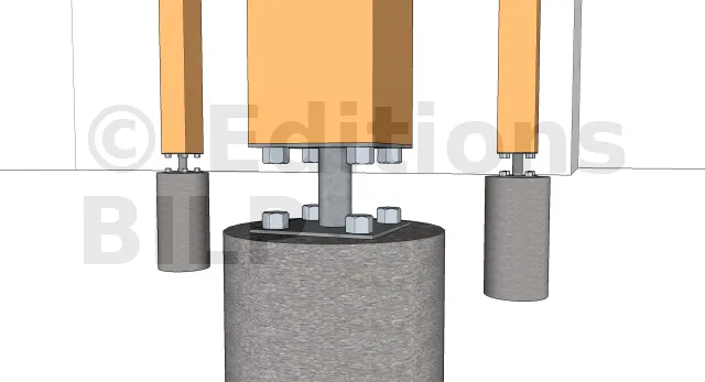 Détails des fixations des poteaux sur les plots en béton