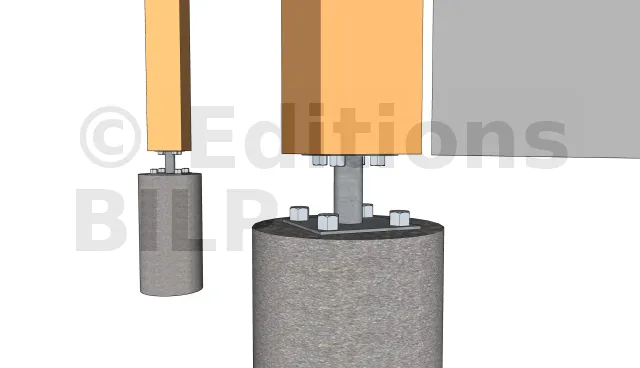 La fixation des poteaux aux plots en béton est réalisée avecdes pieds de poteau. Pour ce projet, nous avons opté pour des pieds de poteau fixes. Ils sont fixés avec des tirefonds aux poteaux et aux plots en béton soit par des goujons d’ancrages, soit par scellement chimique des tiges filetées et par la suite les serrées avec des écrous et des rondelles.
